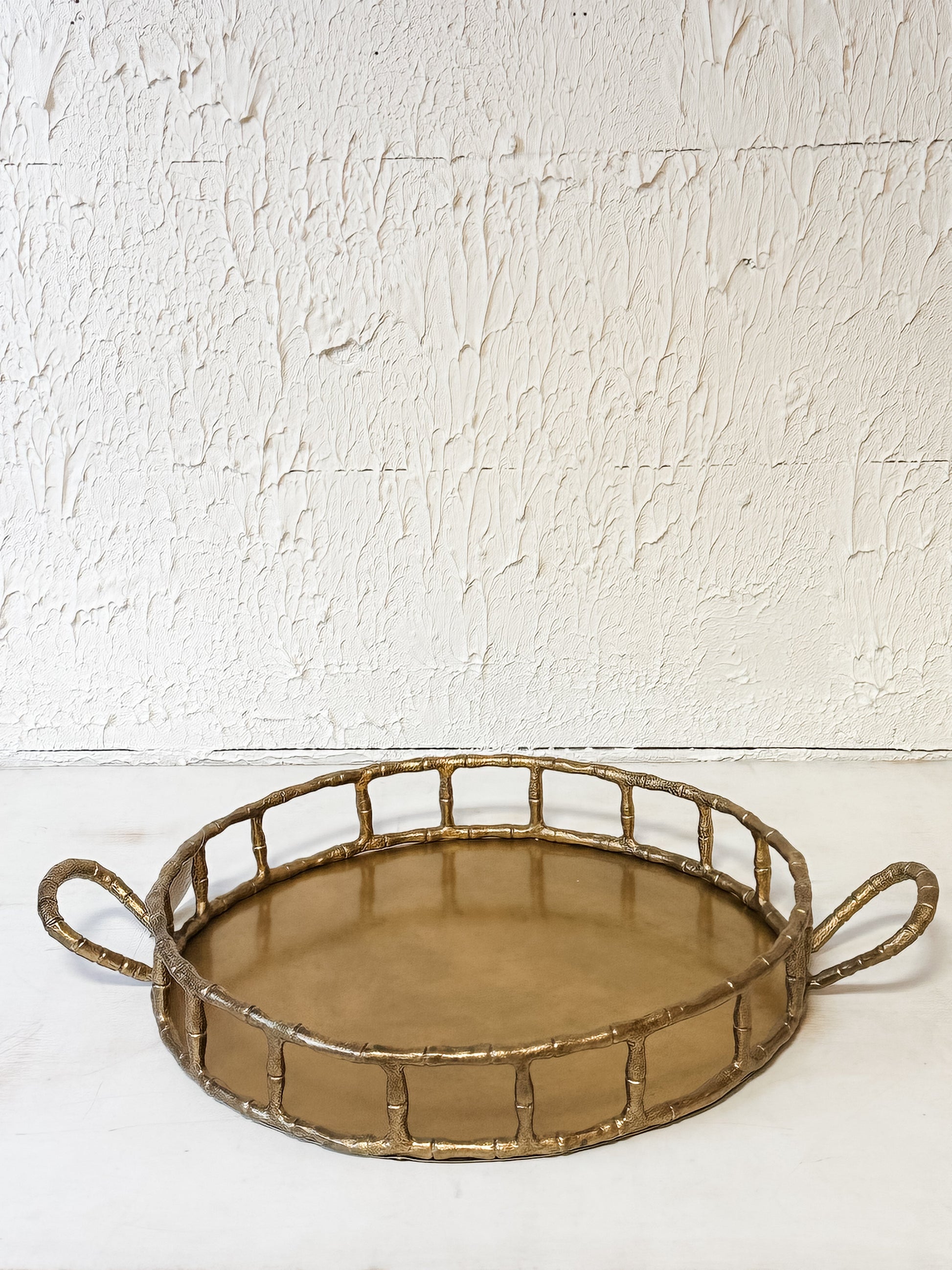 Add a touch of timeless elegance to your home with our Cast Aluminum Faux Bamboo Tray. Designed with a brass finish and sculpted bamboo-inspired frame, this piece blends classic detail with modern durability. Side handles make it as practical as it is stylish, perfect for both serving and display.