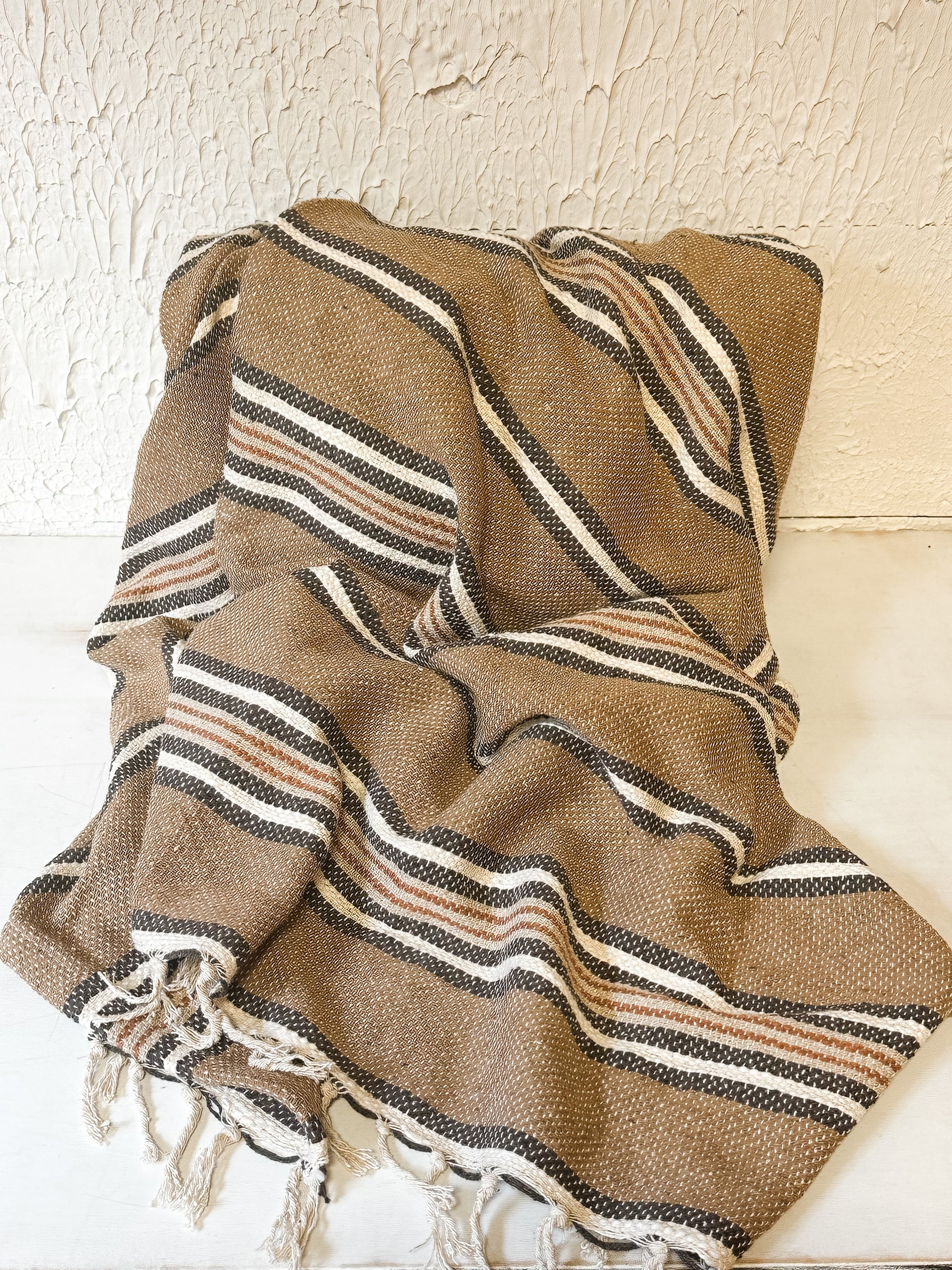 Add warmth and texture to your space with our Rust Stripe Cotton Blend Throw. Measuring 60" L x 50" W, this cozy blanket features a rich rust tone with natural and black stripes, finished with classic fringe for that perfect rustic touch.