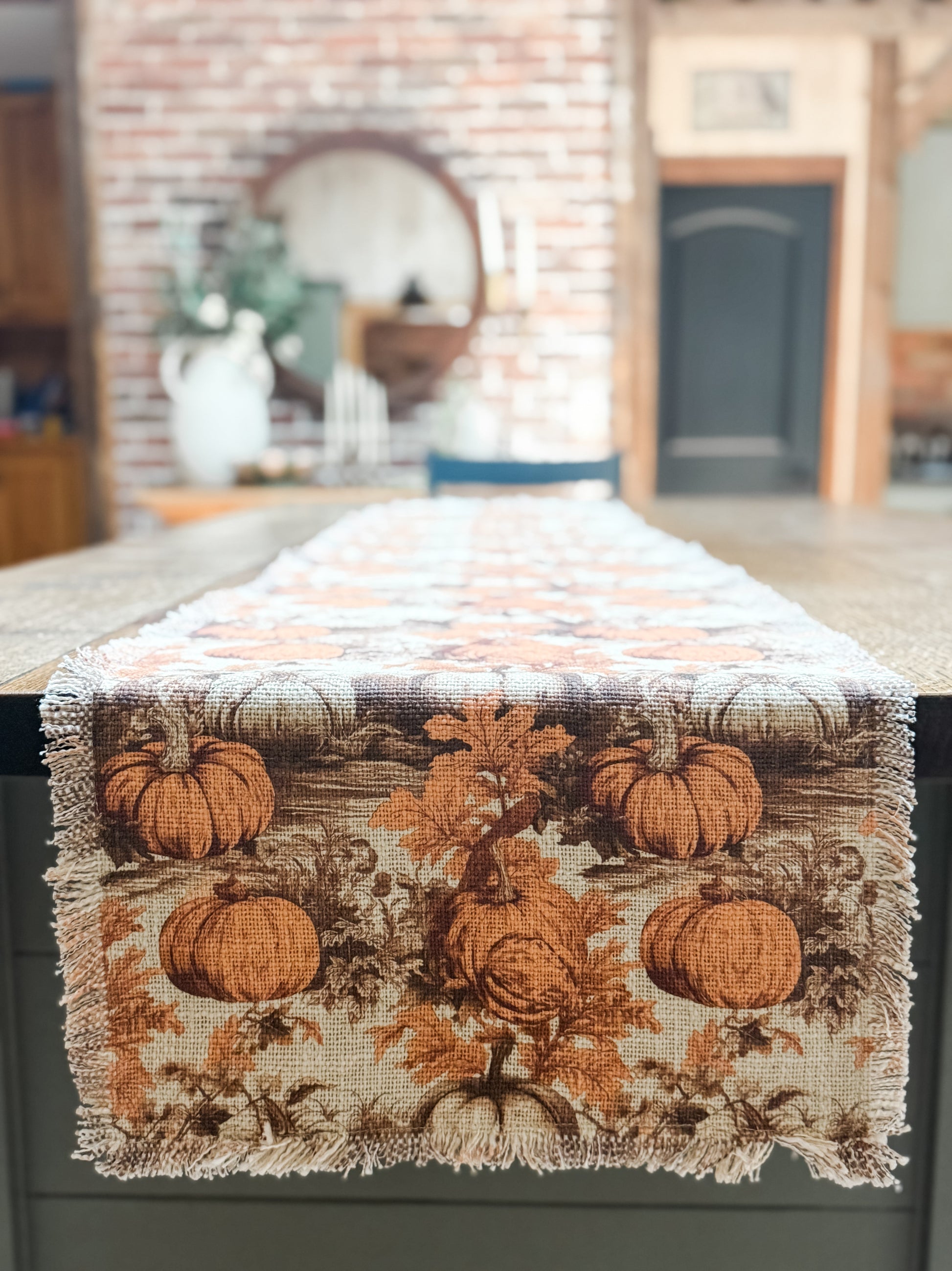 Double the charm, double the fall feels. This 72" reversible table runner features pumpkins and leaves on one side and a coordinating autumn pattern on the other—so you can switch things up whenever the mood strikes. Rich seasonal tones and a 14" width make it a beautiful base for centerpieces, candles, or your favorite serving pieces.