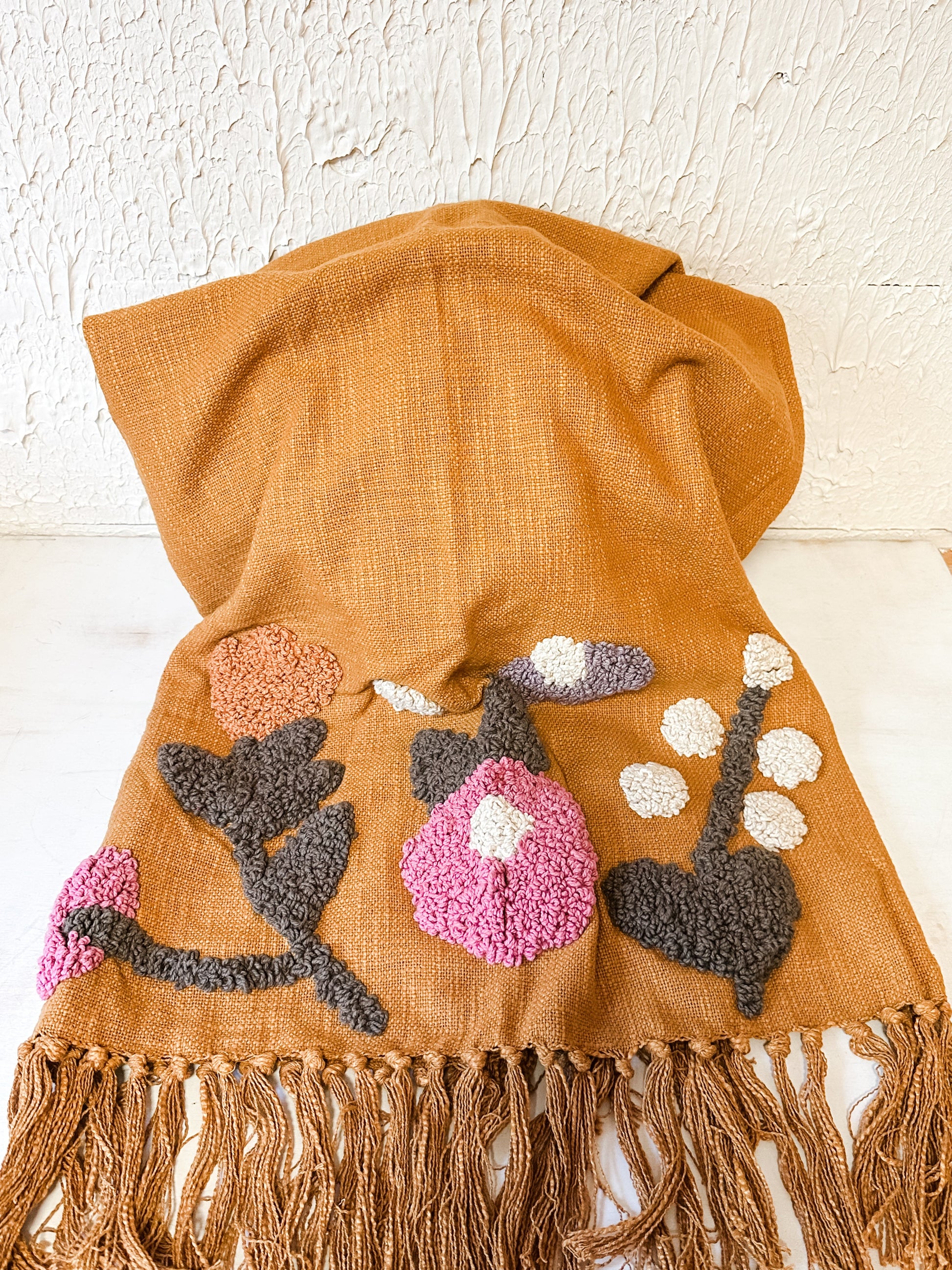 A cotton throw blanket from our Summer Collection displaying various primitive inspired spring flowers made using punch needle technique with tassels on top and bottom edge. Rustic throw blanket measures 51 x 67 inches giving plenty of coverage to accent furniture or to cozy up under the blanket. Our Floral Pops throw blanket is conveniently machine-washable for easy cleaning. A rustic home accent perfect for seasonal use.