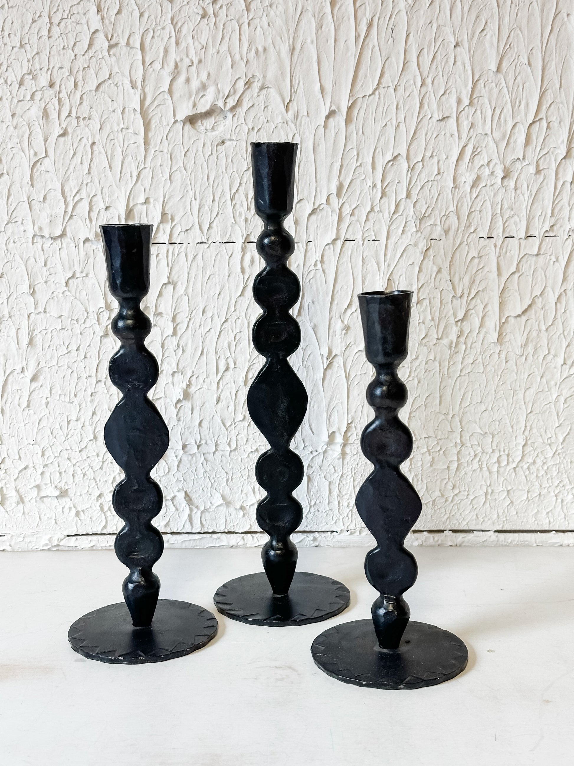 Style them solo for a bold, sculptural moment or mix all three sizes for an artful, staggered display. Pair with your favorite taper candles—warm neutrals for a soft ambiance or deep hues for a striking contrast.