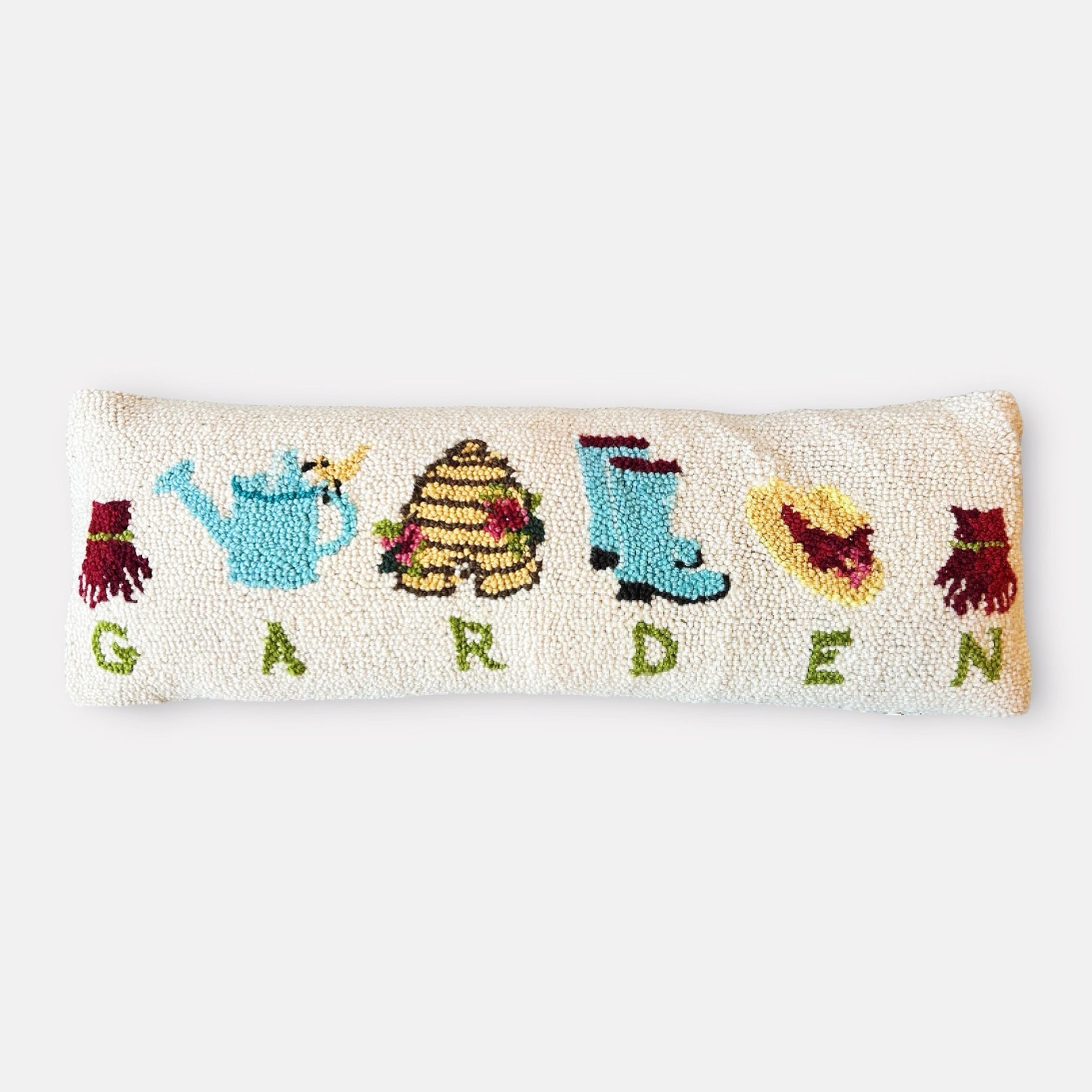 Transform your living space into a serene garden oasis with our Garden Hooked Pillow. This long pillow is adorned with charming garden motifs, including gloves, boots, a hat, and a beehive, intricately crafted to bring the beauty of outdoor tranquility indoors.