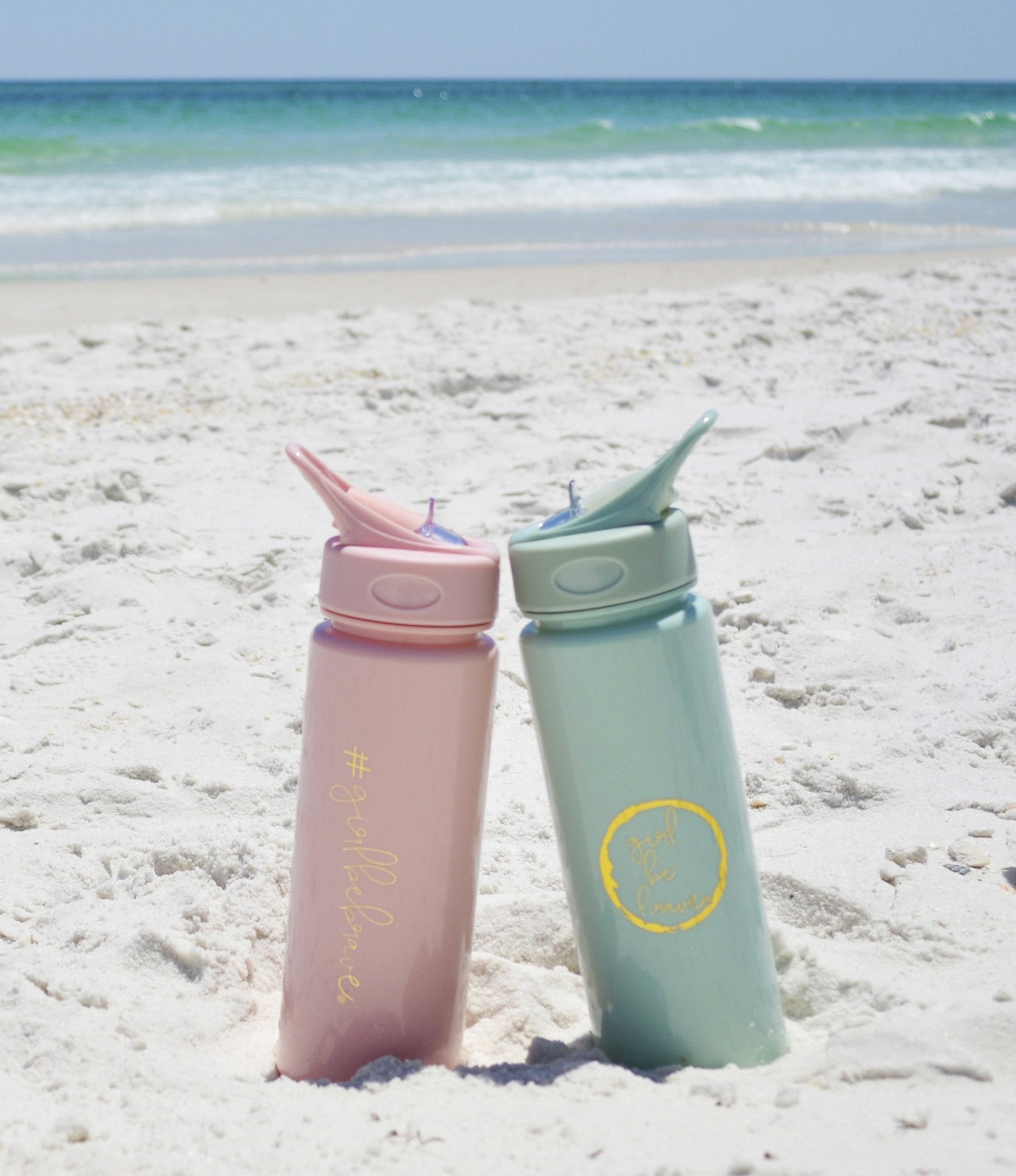 Our ridiculously cute, green or pink and metallic gold Girl Be Brave water bottles are the perfect fitness accessory.? Just imagine hitting the gym with this by your side. Made of thick durable plastic and an easy to clean, removable nozzle. As a special bonus you will also receive a free auto sticker with purchase.?