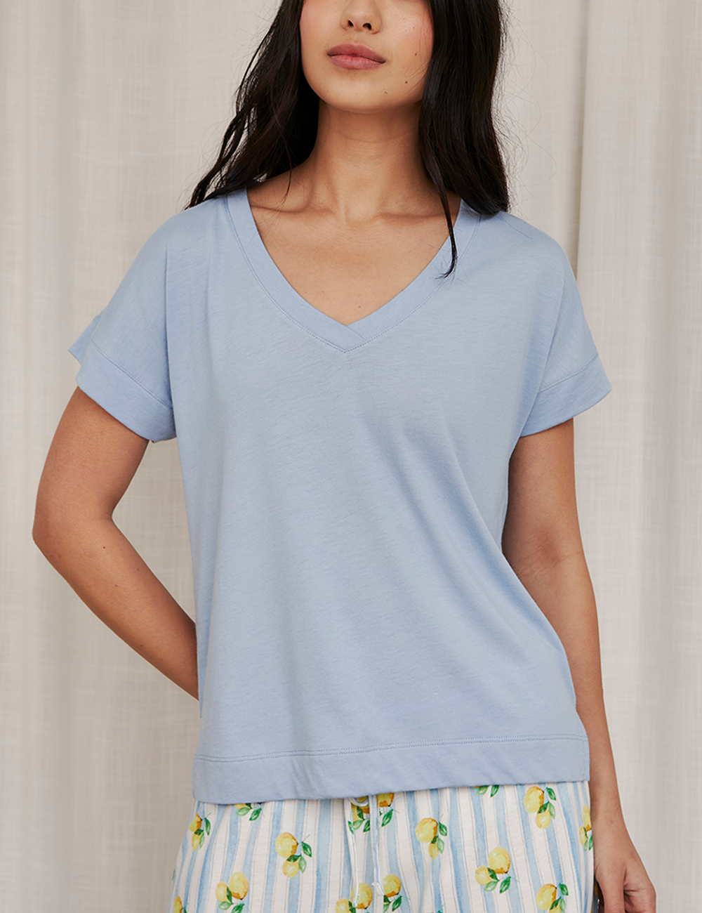 The summer calls for comfortable and airy pieces, making the Harper Morning Sky Top your perfect choice. It features a simple design with a V-neck and side slits at the hem. Pair it effortlessly with this season's capris or shorts. Enjoy the Luxury Finish—a special wash that enhances the fabric’s softness and drape, providing a unique feel against your skin.