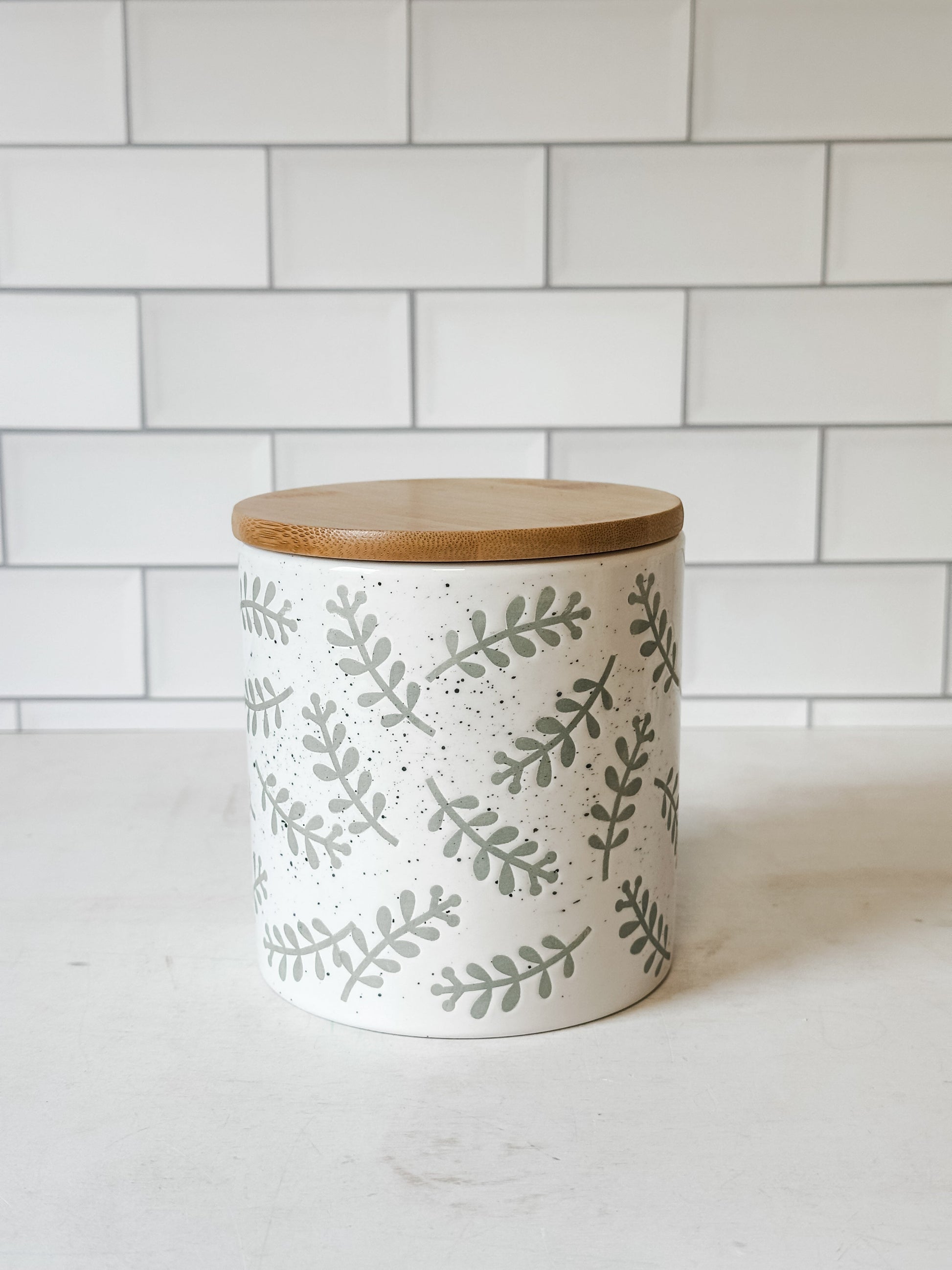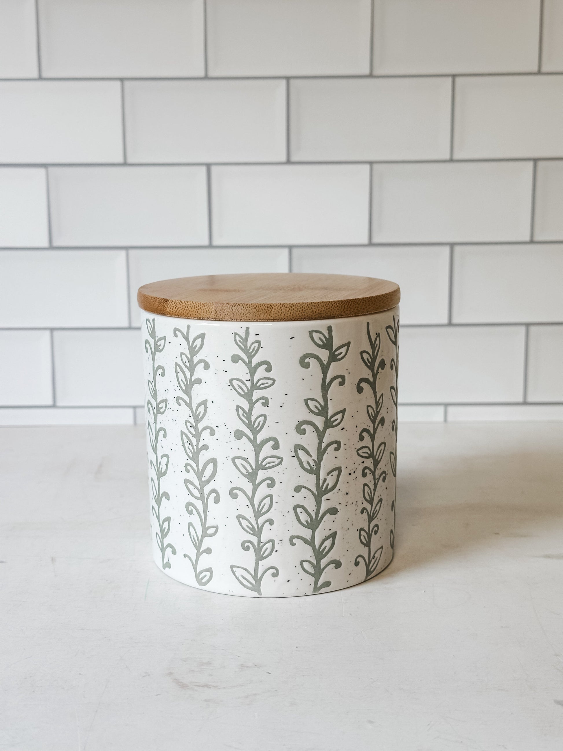 Expertly crafted from durable dolomite, these Leafy Green Canisters feature a vibrant green pattern and stand at 4.75" H x 4.5" Dia. Dishwasher safe for easy cleaning, they add a touch of elegance to any kitchen while keeping your pantry items fresh and organized.