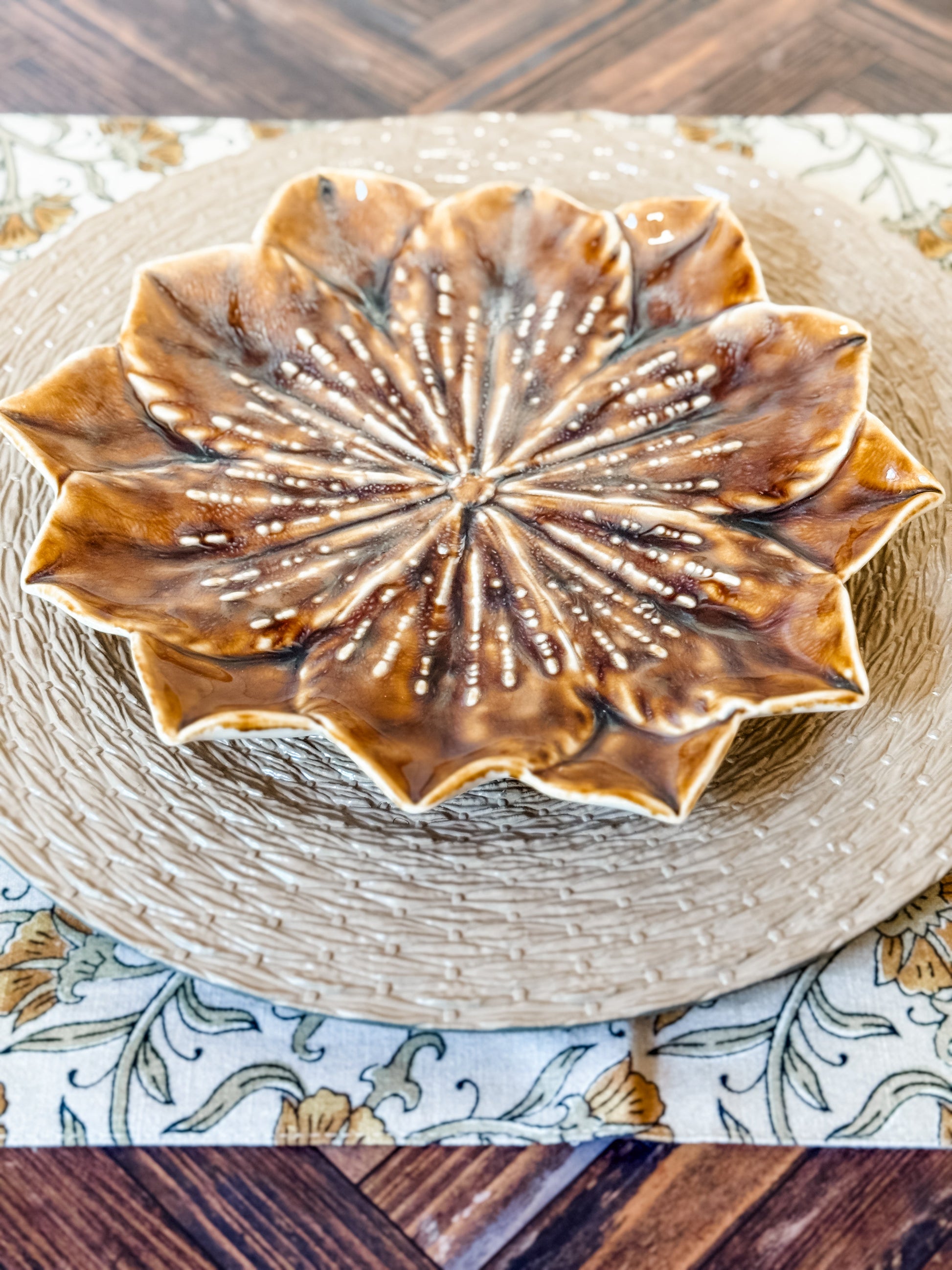 Expertly crafted, this 10" round stoneware plate features a unique flower shape and rich brown reactive glaze. Its durable construction and hand-wash only requirement make it an ideal choice for both everyday use and special occasions. Elevate your dining experience with this stunning piece of serveware. Each one will vary.