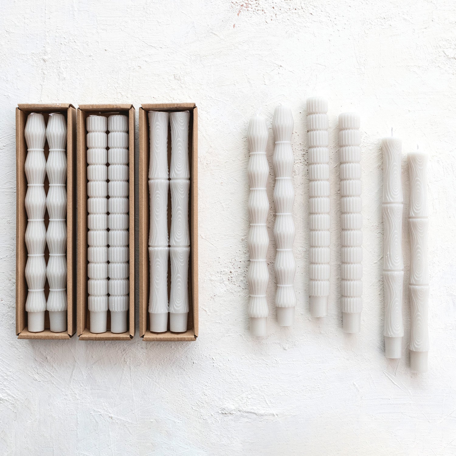 Elevate your decor with our stylish Unscented Sculpted Taper Candles in light grey. With three unique styles to choose from, these candles add a touch of sophistication to any room. Enjoy the ambiance of candlelight without the overpowering scents. Perfect for a cozy night in or a special occasion.