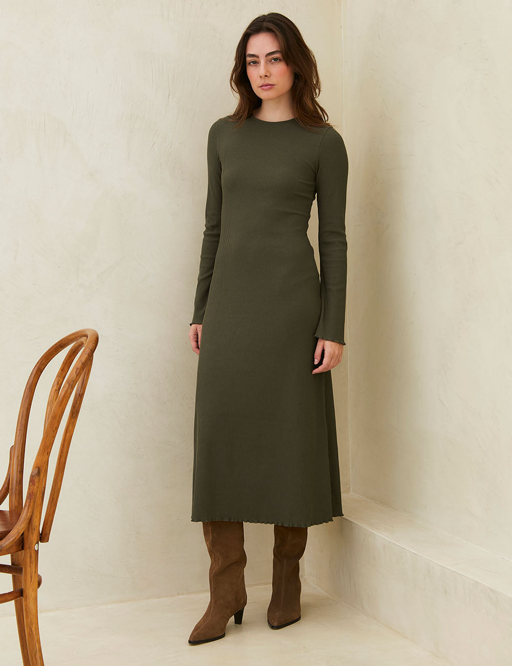 The Amalia Dress Olive features a fitted waistline and a wide, flowing skirt that combines comfort with everyday elegance. Its fluid drape and flared sleeves add natural movement and style. A subtle hem detail enhances its feminine charm, making it perfect for various occasions.
