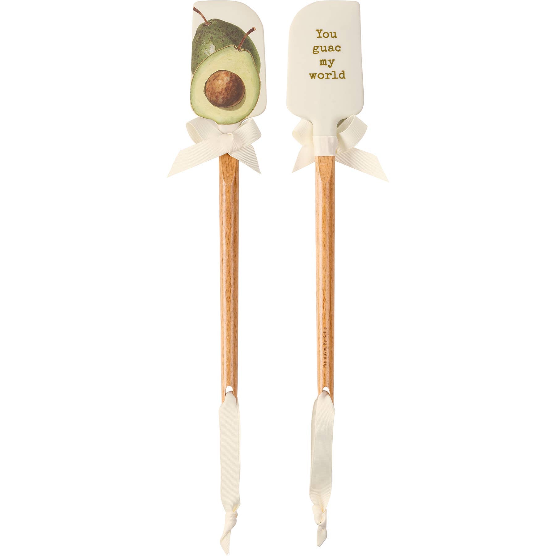 A double-sided silicone spatula features avocado designs on one side, and "You Guac My World" sentiment on the other side. Our Avocado spatula features a logo engraved into wooden handle for added interest and includes a decorative bow and ribbon for hanging. Hand wash recommended; not microwave safe.